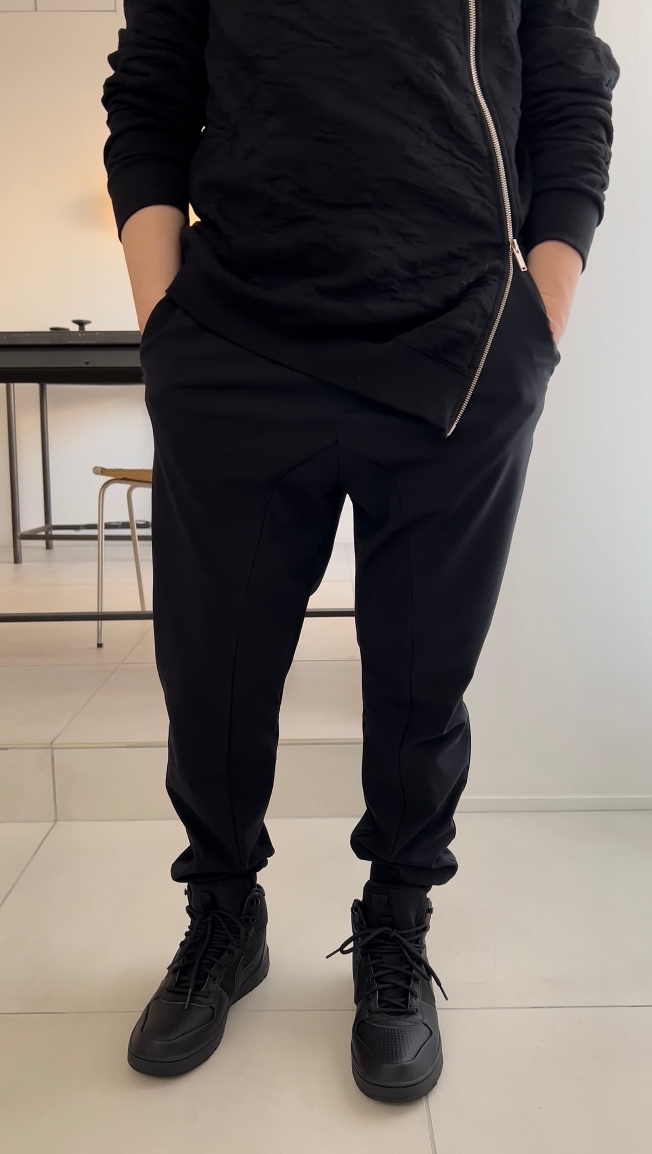 通常のサルエルパンツのように極端に股上を深く設定せず、スラックスの様に型紙をつくっているので、股ぐりにサルエルパンツ特有の嫌なダブ付きが出ません。